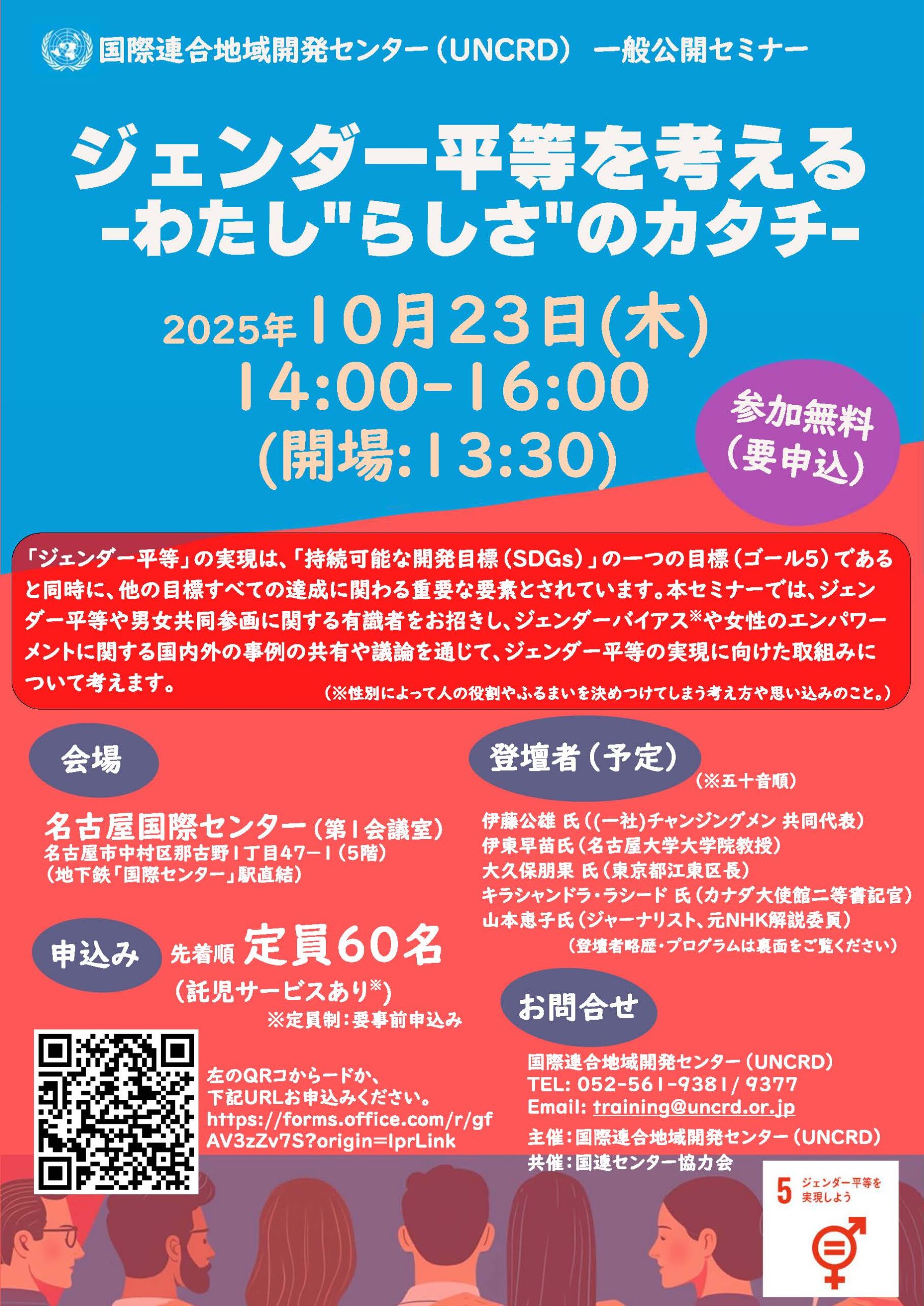 国際連合地域開発センター(UNCRD)では、持続可能な開発目標(SDGs)についての理解を深めていただき、地域における取組みについて共に考えることを目的として、SDGsに関する一般公開セミナーを開催しています。第9回目となる今回は、SDGsのうちゴール5「ジェンダー平等を実現しよう」に焦点を当て、ジェンダー平等の推進に向けた取組みについて考えます。