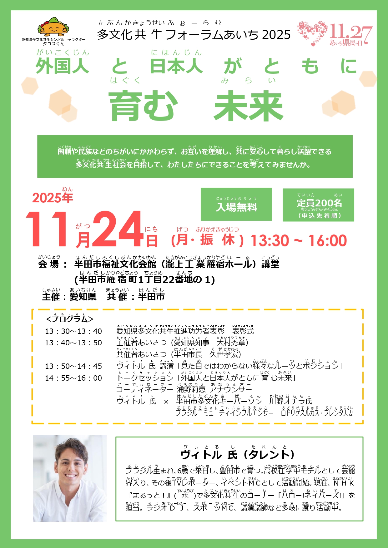 タレントのヴィトル氏による講演や、半田市で暮らす外国人県民の方々を交えたトークセッションを行います。