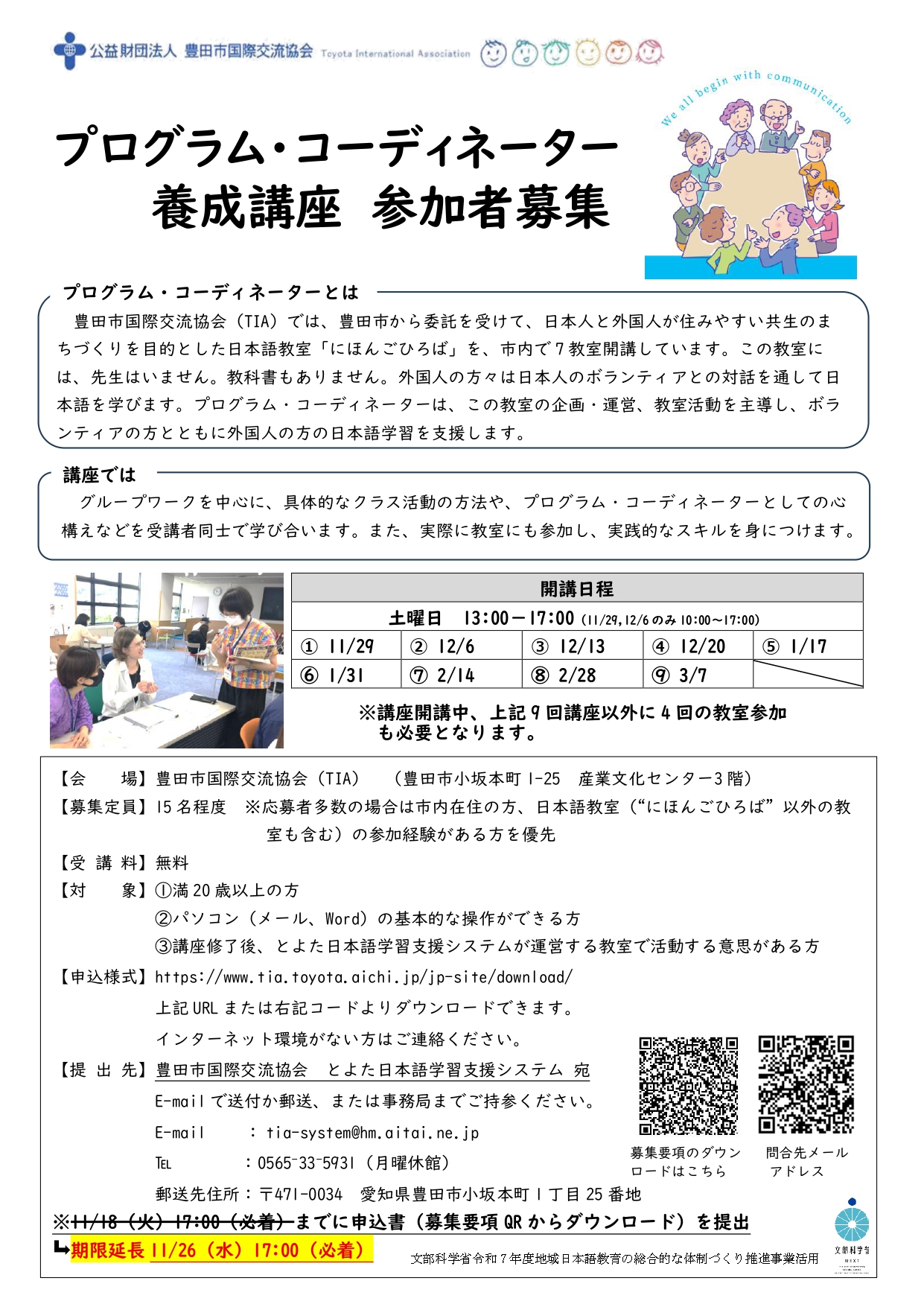 豊田市国際交流協会では豊田市から委託を受けて日本語教室を市内で7教室開校しています。 その教室における企画・運営、教室活動を主導する人材の育成