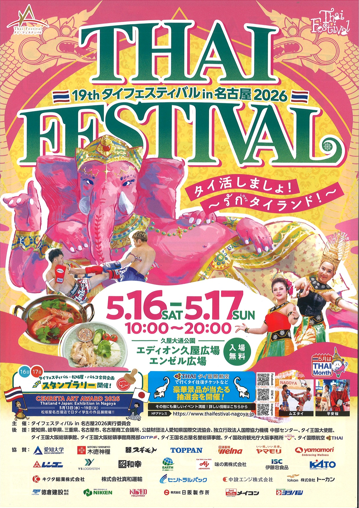 ステージイベントによるタイ文化(タイ舞踊、ムエタイ)の紹介、タイ旅行体験ゾーン、タイカルチャーゾーン、リラクゼーションゾーンでタイをまるごと体験、またタイ料理・工芸品の販売を通じ愛知県を中心とした東海地方の方にタイ王国に親しんでいただく場を提供致します。 開催初日の開会式にはタイ王国駐日特命全権大使閣下、愛知県知事など来賓10名余りにご来臨を予定しています。
